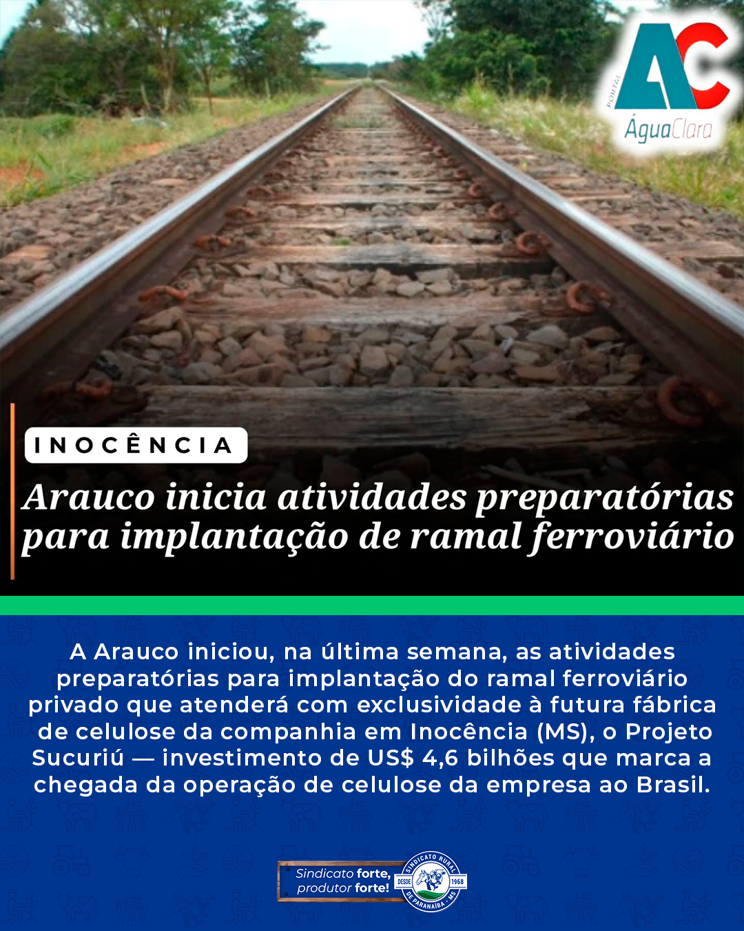 A Arauco iniciou, na última semana, as atividades preparatórias para implantação do ramal ferroviário privado que atenderá com exclusividade à futura fábrica de celulose da companhia em Inocência (MS), o Projeto Sucuriú — investimento de US$ 4,6 bilhões q