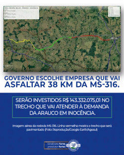 A empresa Engenharia e Comércio Bandeirantes Ltda será a responsável pela obra que vai asfaltar 38 quilômetros da MS-316, em Inocência. A homologação da licitação foi publicada no Diário Oficial do Estado desta terça-feira (04/11). De acordo com a publicação, serão investidos R$ 143.332.075,01 no trecho que vai atender à demanda da fábrica de celulose da empresa chilena Arauco.