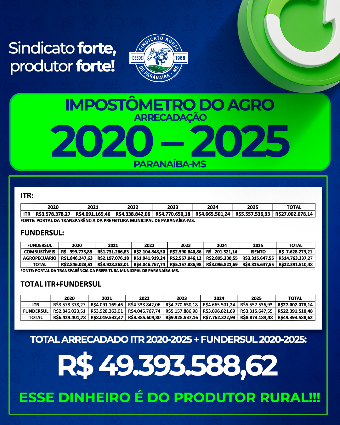 IMPOSTÔMETRO DO AGRO - ARRECADAÇÃO 2020-2025 - PARANAÍBA-MSTOTAL ARRECADADO ITR 2020-2025 + FUNDERSUL 2020-2025: R$49.393.588,62ESSE DINHEIRO É DO PRODUTOR RURAL!!!