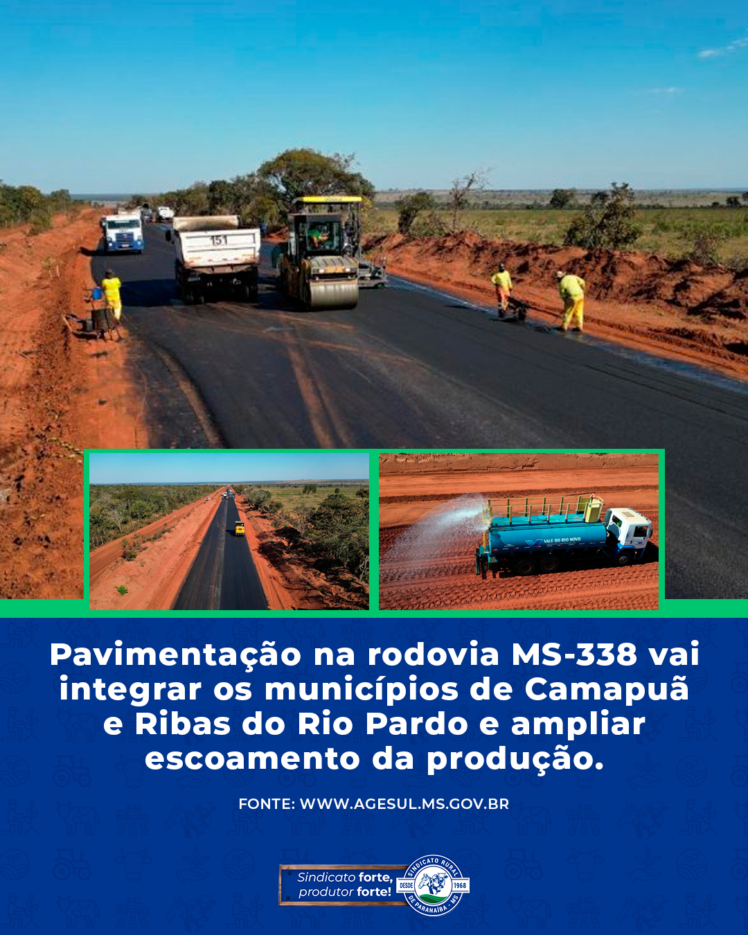 Pavimentação na rodovia MS-338 vai integrar os municípios de Camapuã e Ribas do Rio Pardo e ampliar escoamento da produção.
