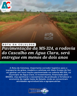 A Rota da Celulose, importante corredor logístico para o transporte de grãos, madeira e celulose em Mato Grosso do Sul, vai ganhar um novo trecho pavimentado na rodovia MS-324, no município de Água Clara. O investimento, financiado pelo BNDES, visa aprimorar o escoamento da produção e fortalecer a economia da região leste do Estado, onde se concentram atividades agroindustriais e agropecuárias.